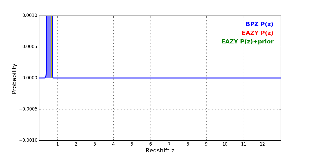 In P(z) plots: Yellow lines mark the cluster redshift z = 0.677,