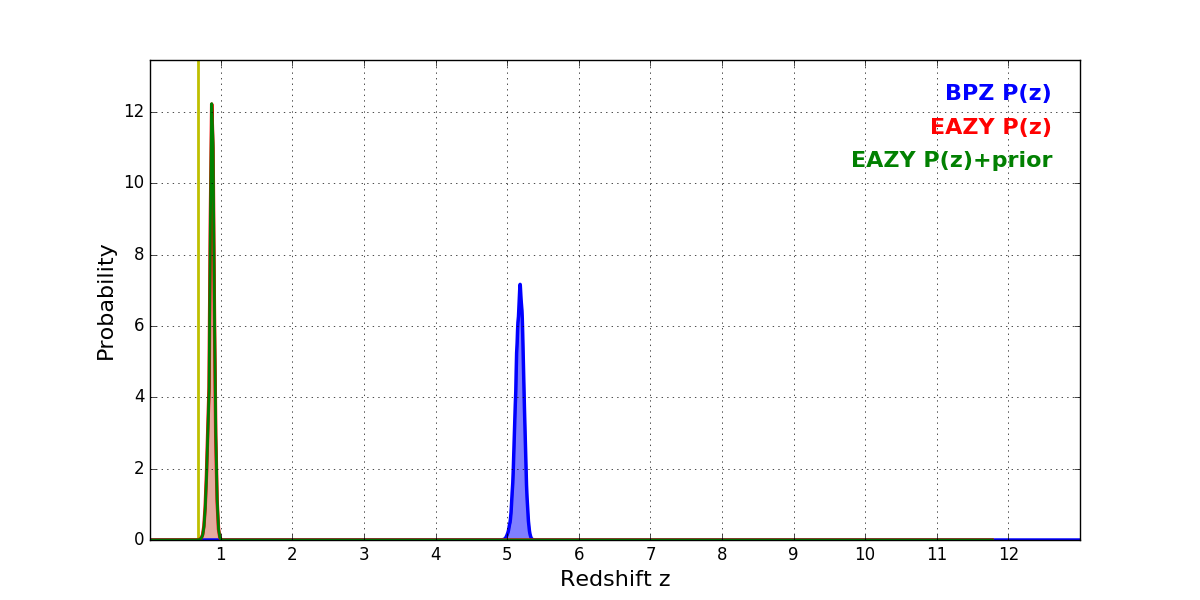 In P(z) plots: Yellow lines mark the cluster redshift z = 0.677,