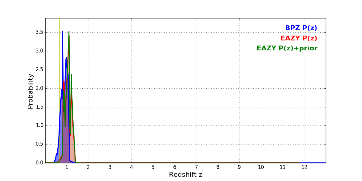 In P(z) plots: Yellow lines mark the cluster redshift z = 0.677,