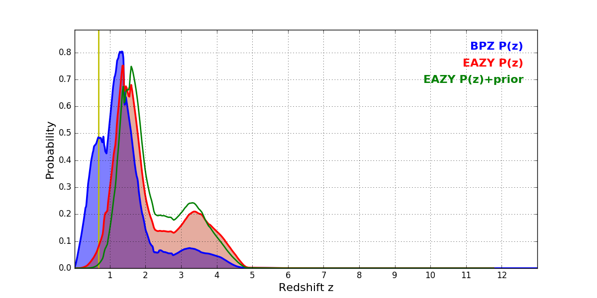 In P(z) plots: Yellow lines mark the cluster redshift z = 0.677,
