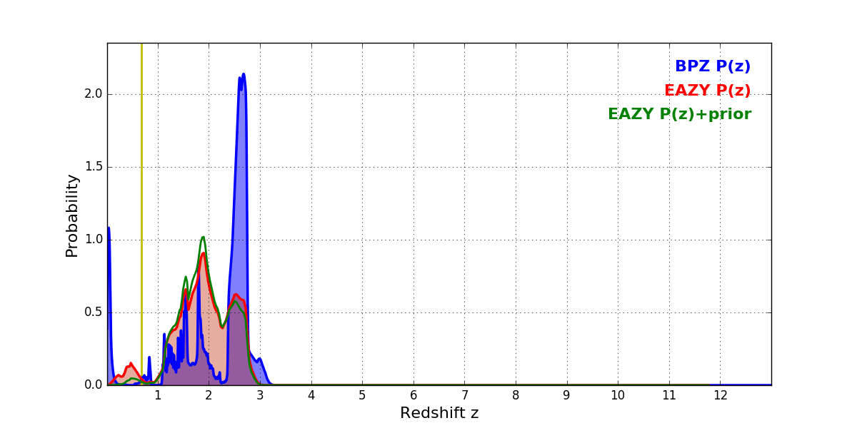 In P(z) plots: Yellow lines mark the cluster redshift z = 0.677,