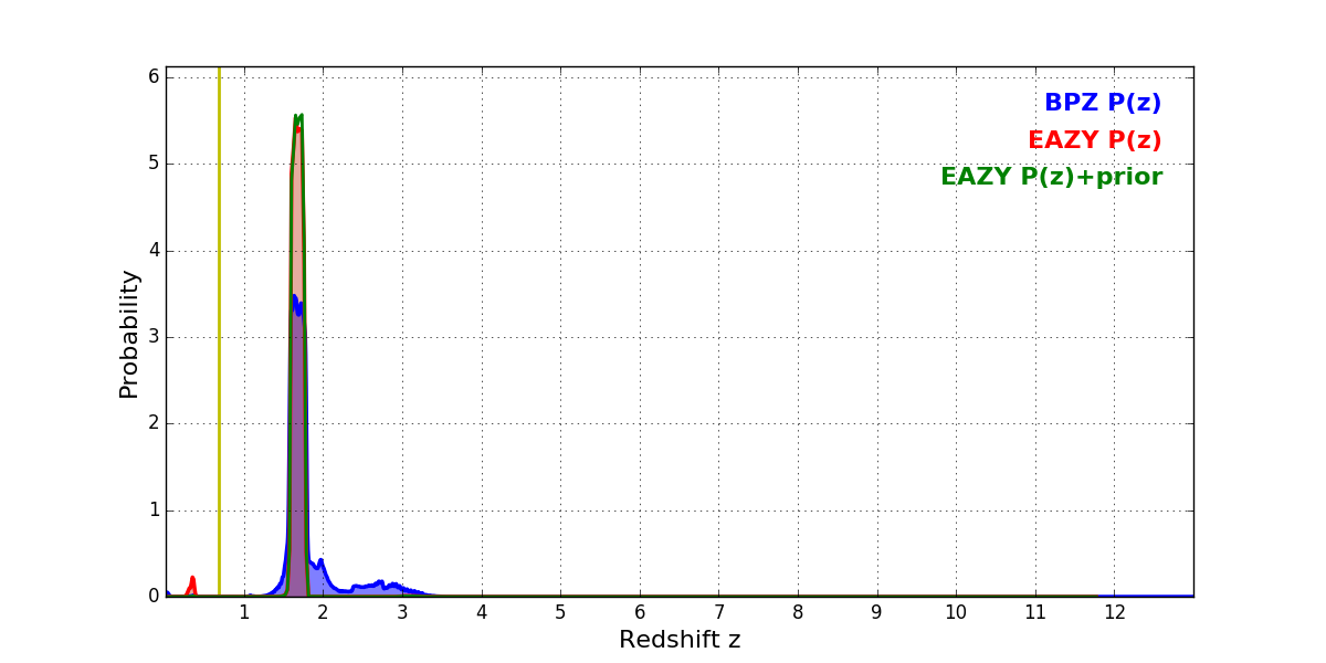 In P(z) plots: Yellow lines mark the cluster redshift z = 0.677,