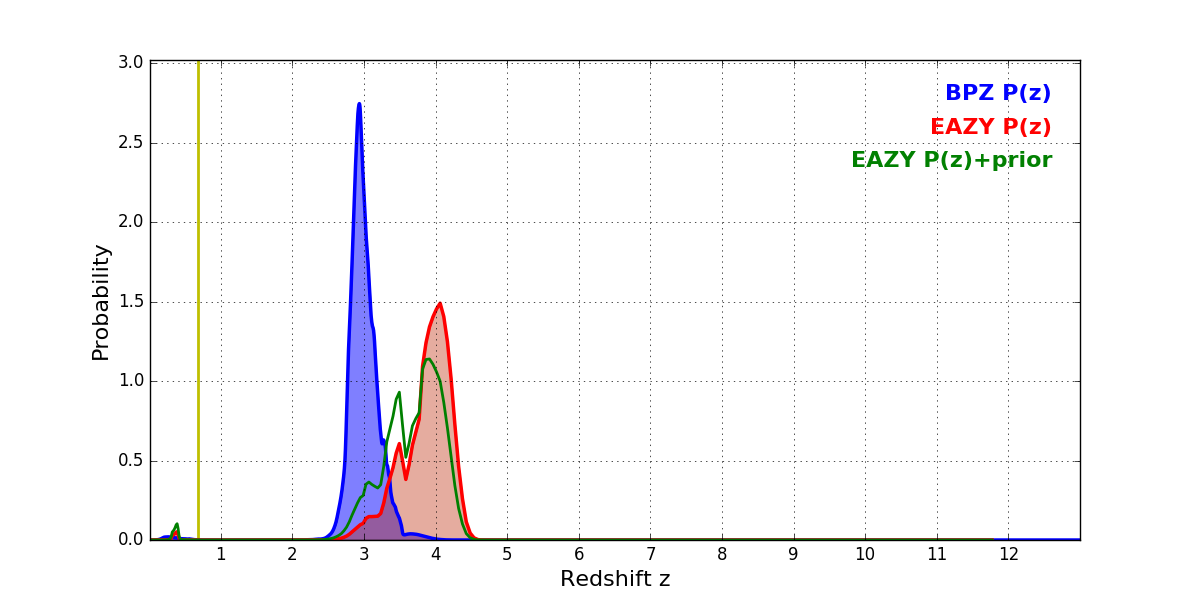 In P(z) plots: Yellow lines mark the cluster redshift z = 0.677,