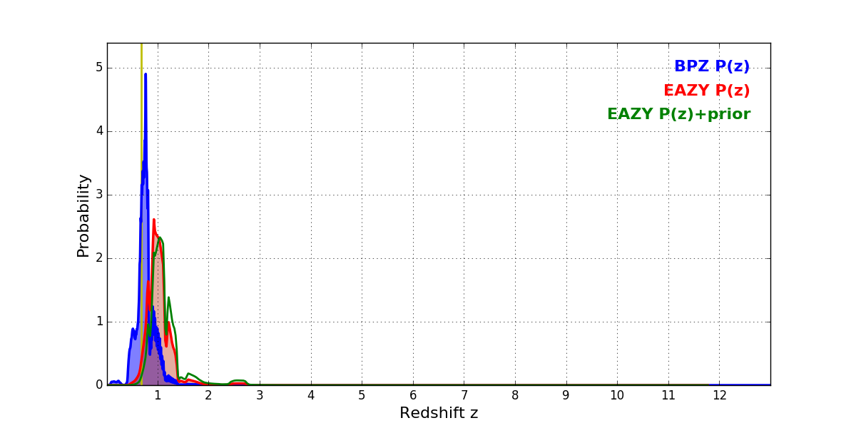 In P(z) plots: Yellow lines mark the cluster redshift z = 0.677,