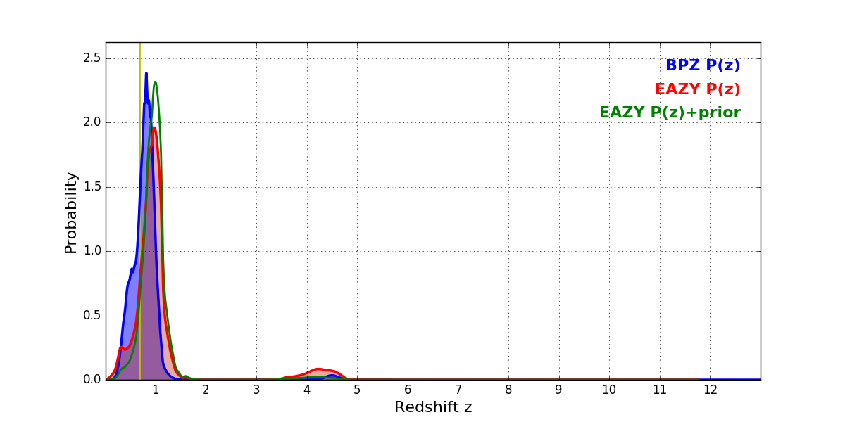 In P(z) plots: Yellow lines mark the cluster redshift z = 0.677,