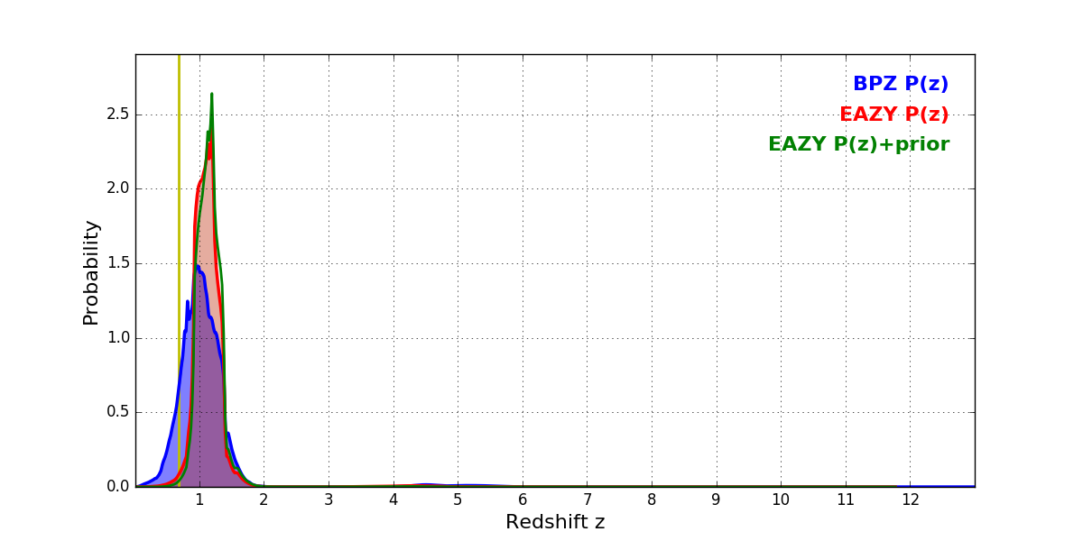 In P(z) plots: Yellow lines mark the cluster redshift z = 0.677,