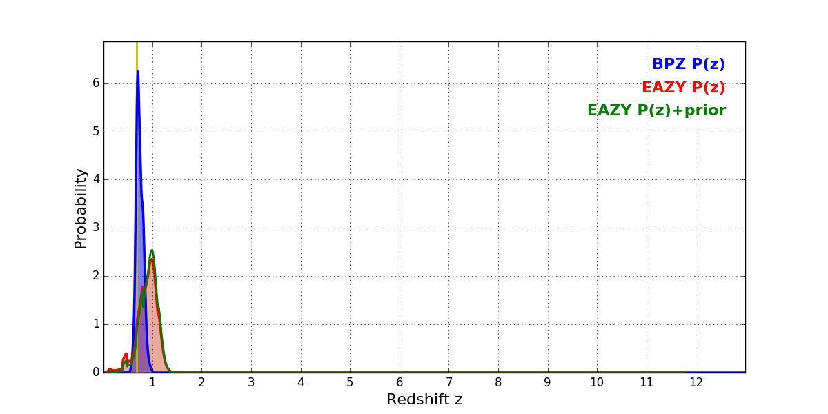 In P(z) plots: Yellow lines mark the cluster redshift z = 0.677,