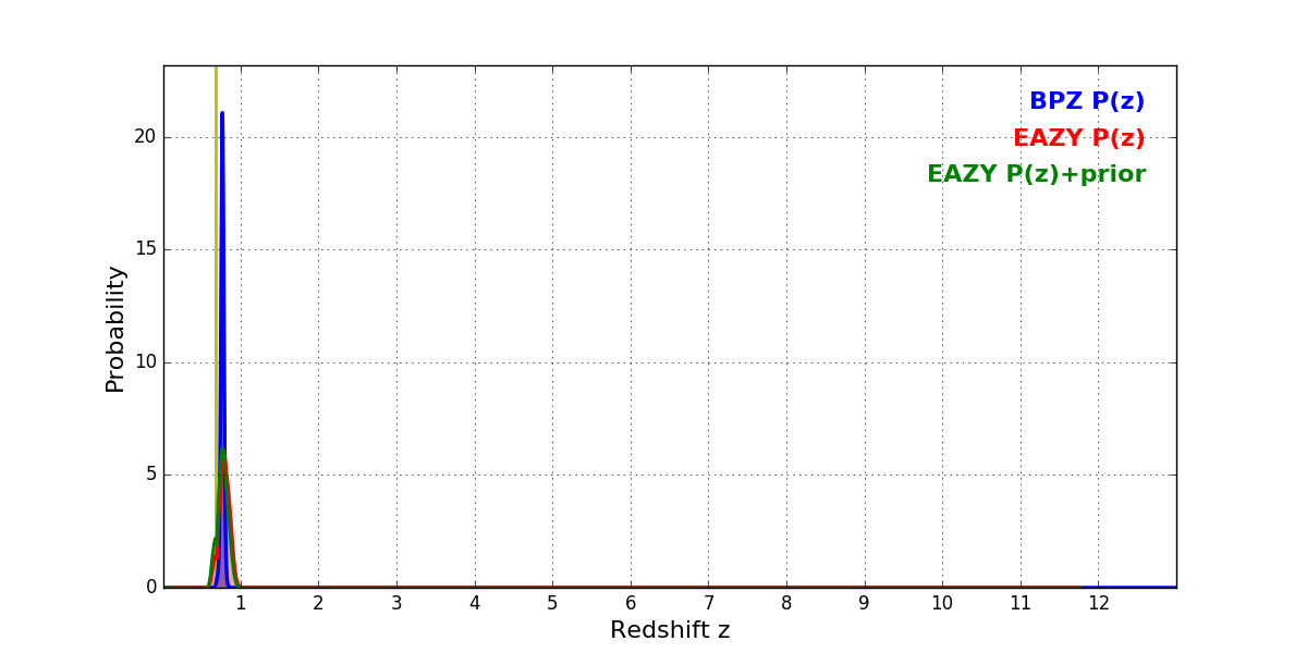 In P(z) plots: Yellow lines mark the cluster redshift z = 0.677,