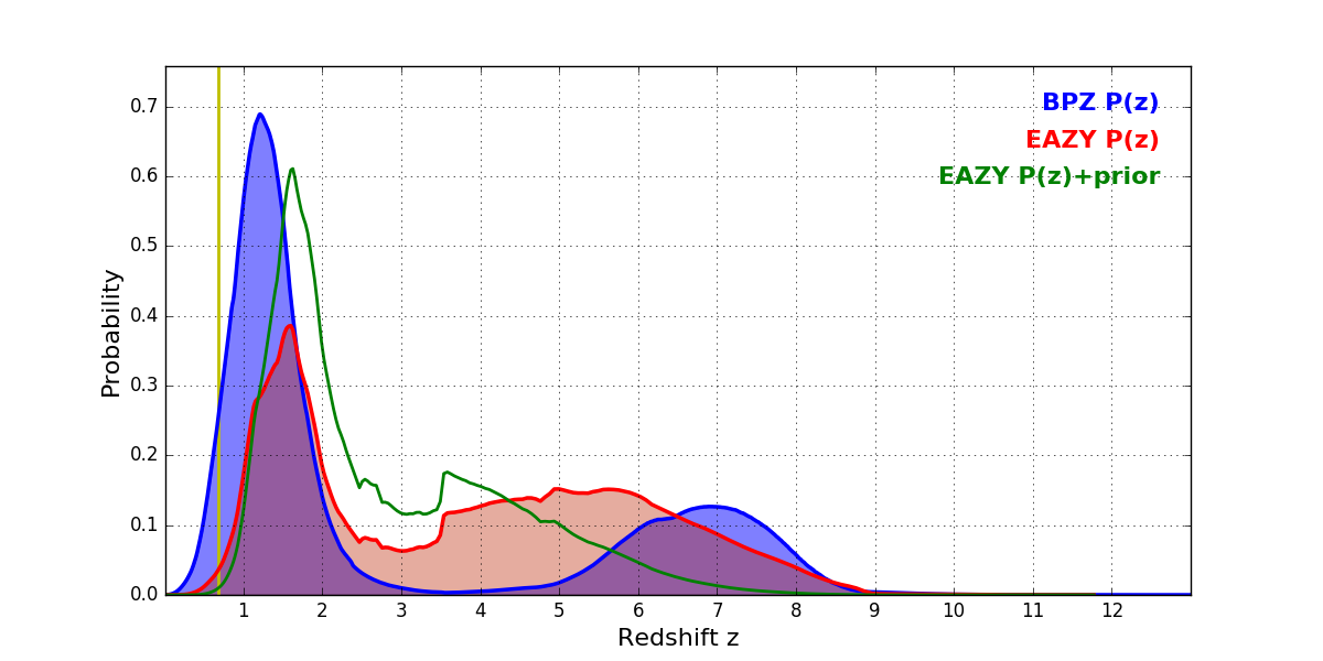 In P(z) plots: Yellow lines mark the cluster redshift z = 0.677,