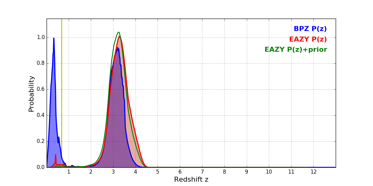 In P(z) plots: Yellow lines mark the cluster redshift z = 0.677,
