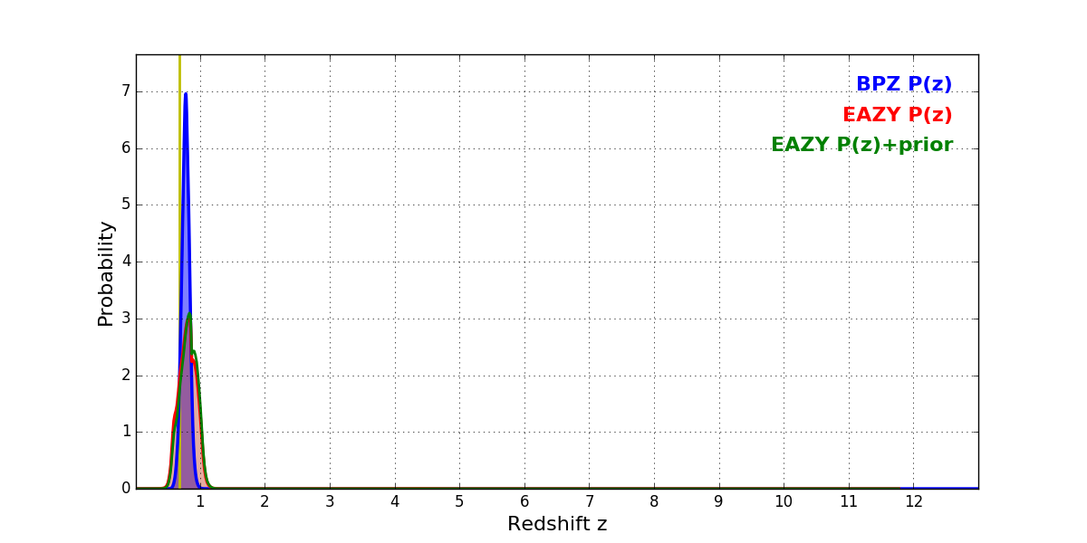 In P(z) plots: Yellow lines mark the cluster redshift z = 0.677,