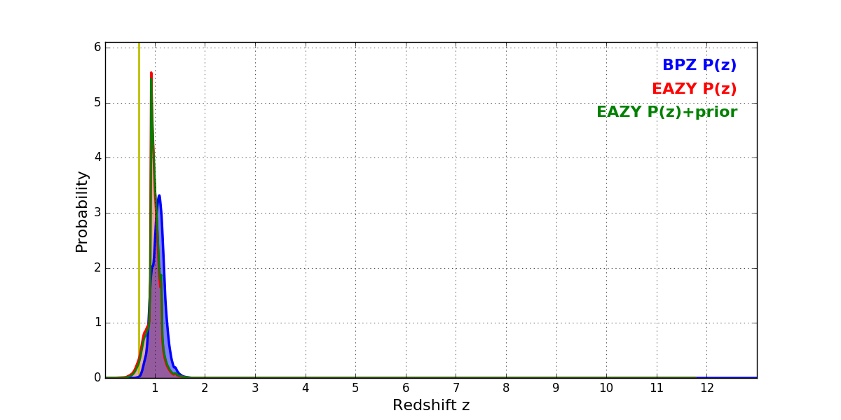 In P(z) plots: Yellow lines mark the cluster redshift z = 0.677,