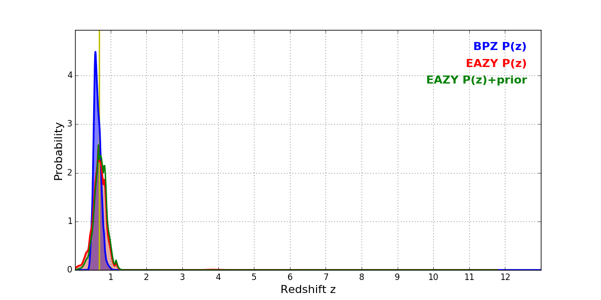 In P(z) plots: Yellow lines mark the cluster redshift z = 0.677,