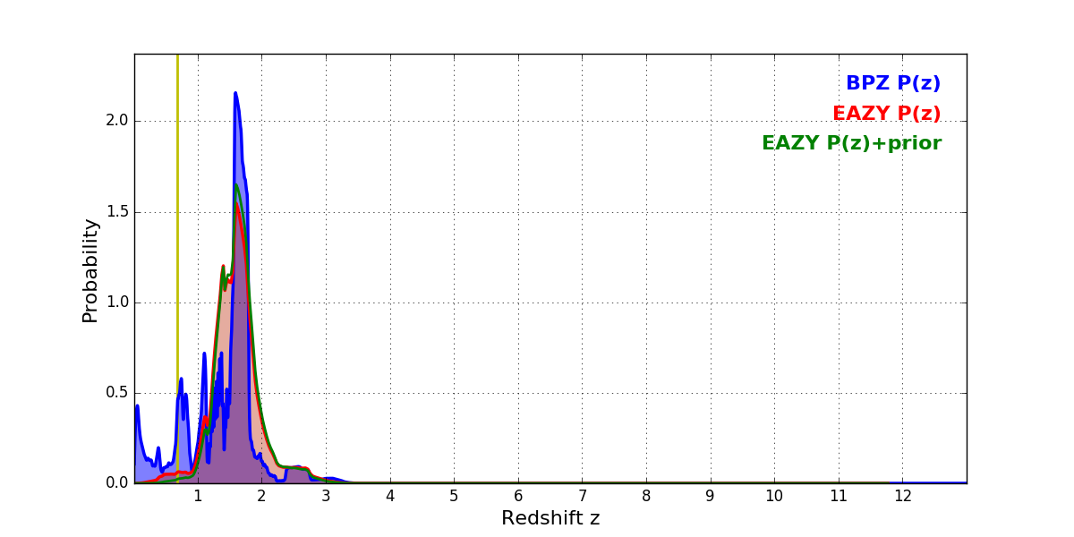 In P(z) plots: Yellow lines mark the cluster redshift z = 0.677,