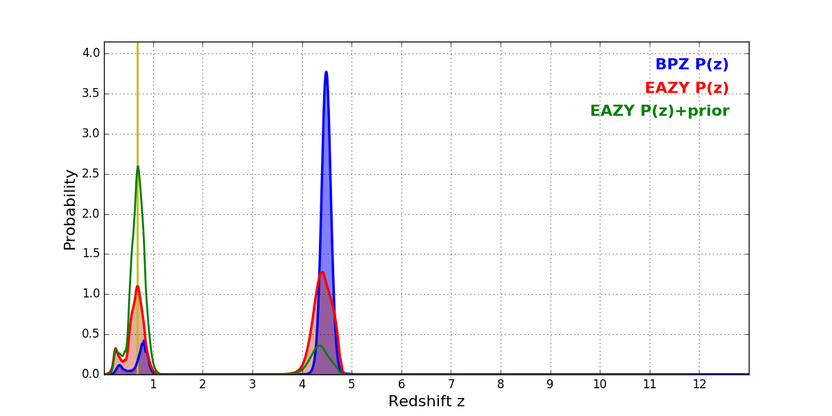 In P(z) plots: Yellow lines mark the cluster redshift z = 0.677,