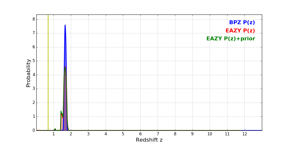 In P(z) plots: Yellow lines mark the cluster redshift z = 0.677,