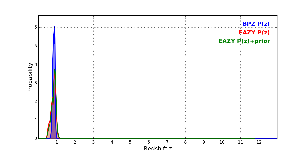 In P(z) plots: Yellow lines mark the cluster redshift z = 0.677,