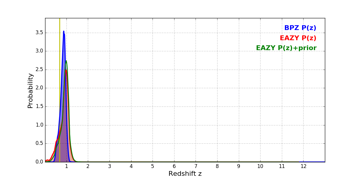 In P(z) plots: Yellow lines mark the cluster redshift z = 0.677,