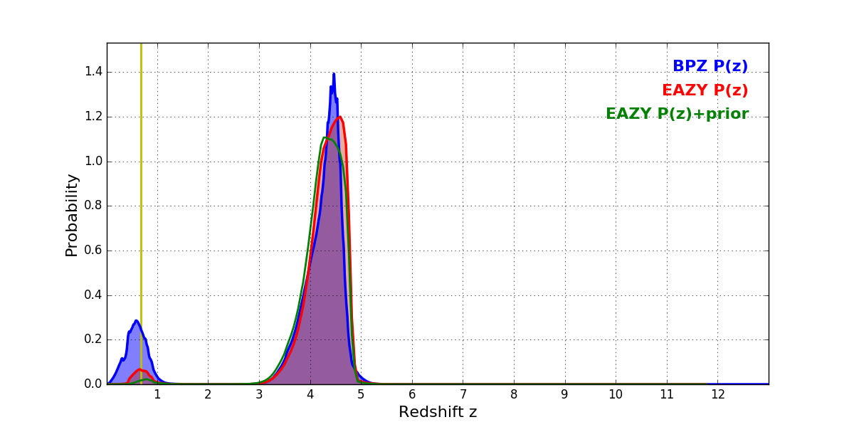 In P(z) plots: Yellow lines mark the cluster redshift z = 0.677,