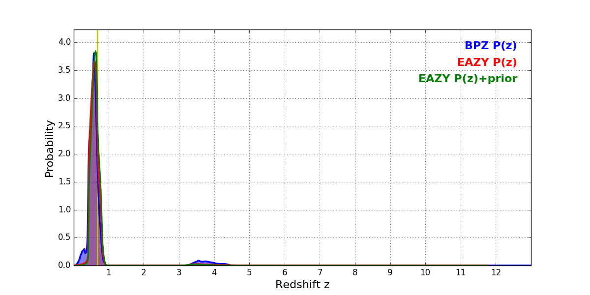 In P(z) plots: Yellow lines mark the cluster redshift z = 0.677,