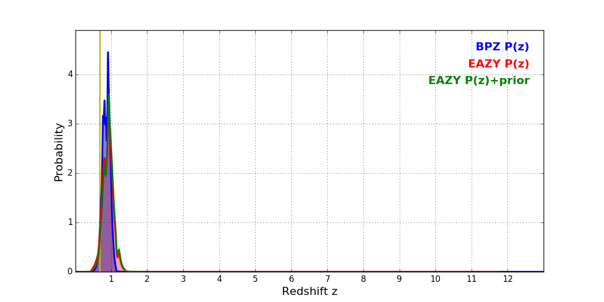 In P(z) plots: Yellow lines mark the cluster redshift z = 0.677,