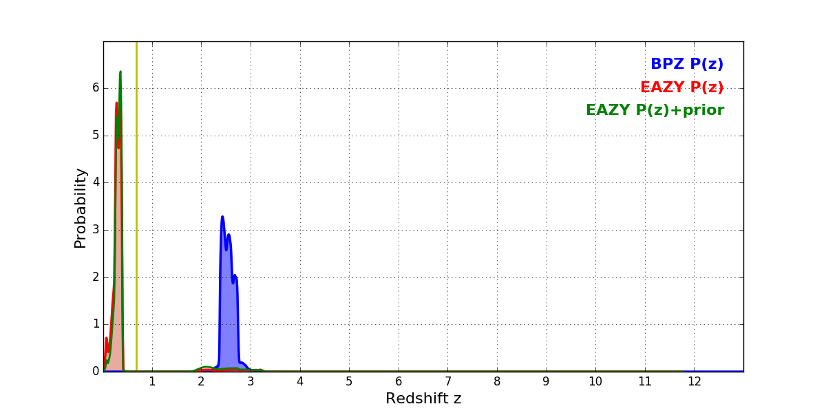 In P(z) plots: Yellow lines mark the cluster redshift z = 0.677,