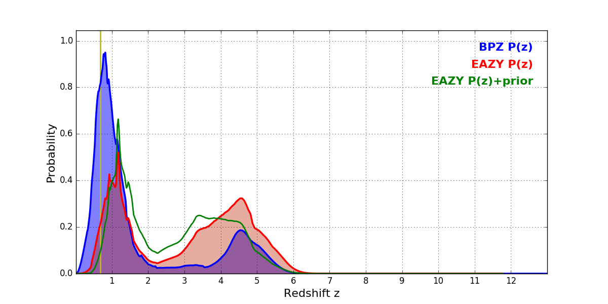 In P(z) plots: Yellow lines mark the cluster redshift z = 0.677,