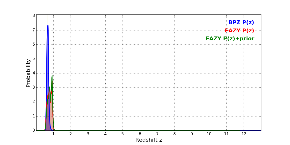 In P(z) plots: Yellow lines mark the cluster redshift z = 0.677,