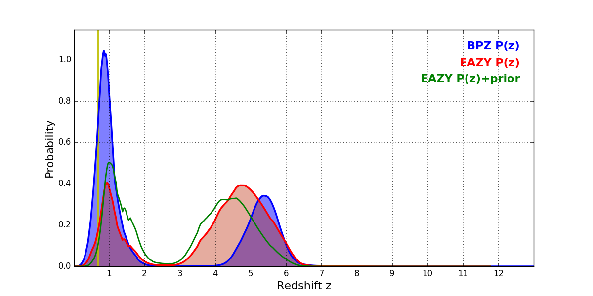 In P(z) plots: Yellow lines mark the cluster redshift z = 0.677,