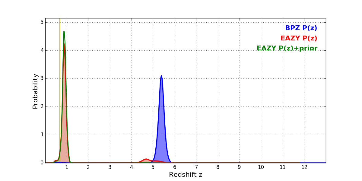 In P(z) plots: Yellow lines mark the cluster redshift z = 0.677,