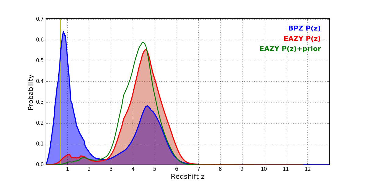 In P(z) plots: Yellow lines mark the cluster redshift z = 0.677,