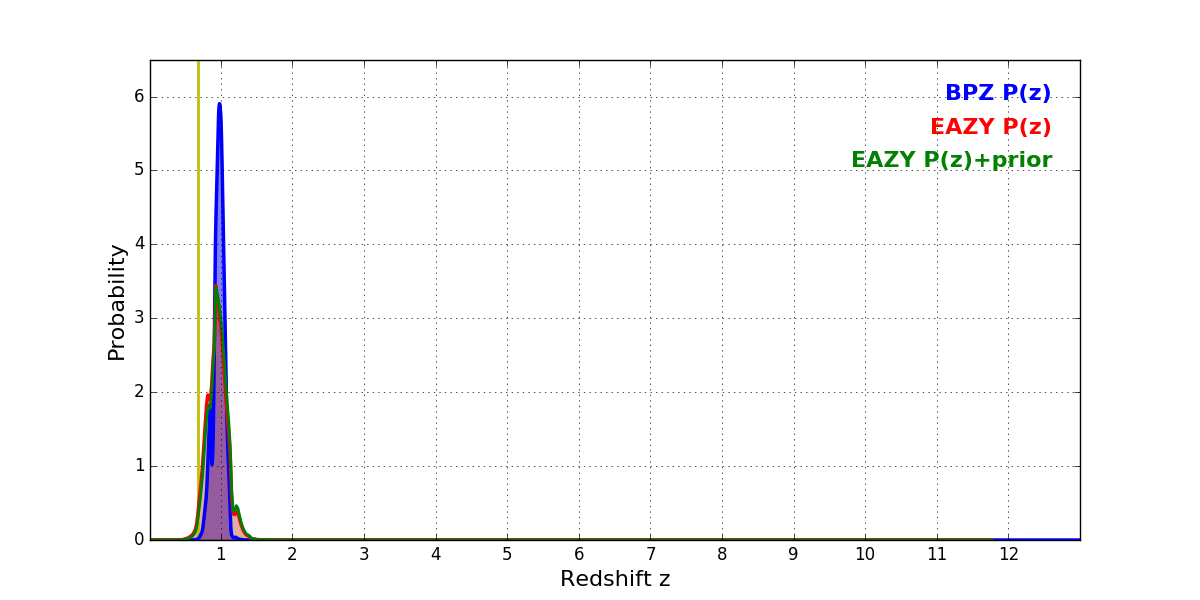 In P(z) plots: Yellow lines mark the cluster redshift z = 0.677,