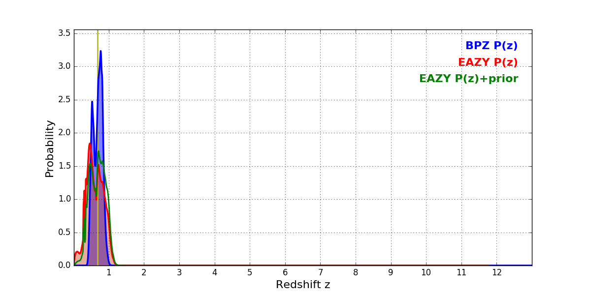 In P(z) plots: Yellow lines mark the cluster redshift z = 0.677,