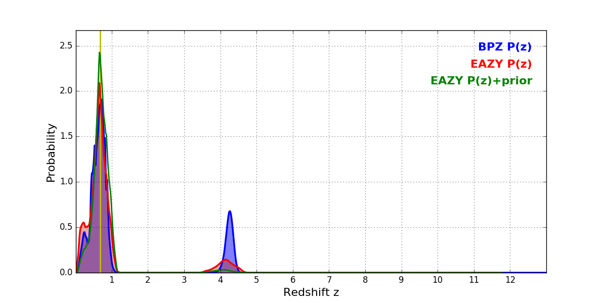 In P(z) plots: Yellow lines mark the cluster redshift z = 0.677,
