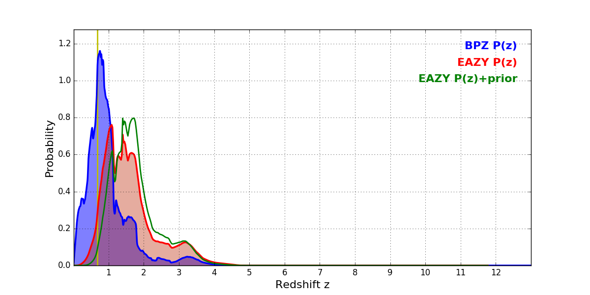In P(z) plots: Yellow lines mark the cluster redshift z = 0.677,