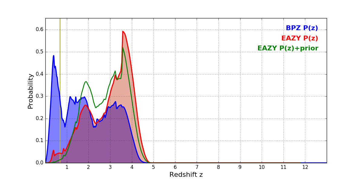 In P(z) plots: Yellow lines mark the cluster redshift z = 0.677,