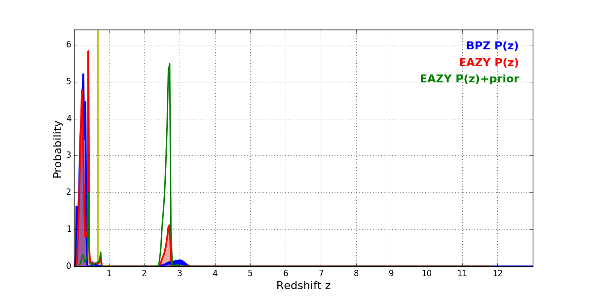In P(z) plots: Yellow lines mark the cluster redshift z = 0.677,