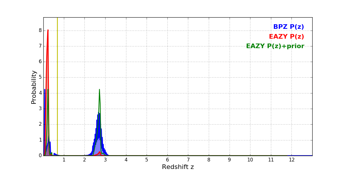 In P(z) plots: Yellow lines mark the cluster redshift z = 0.677,