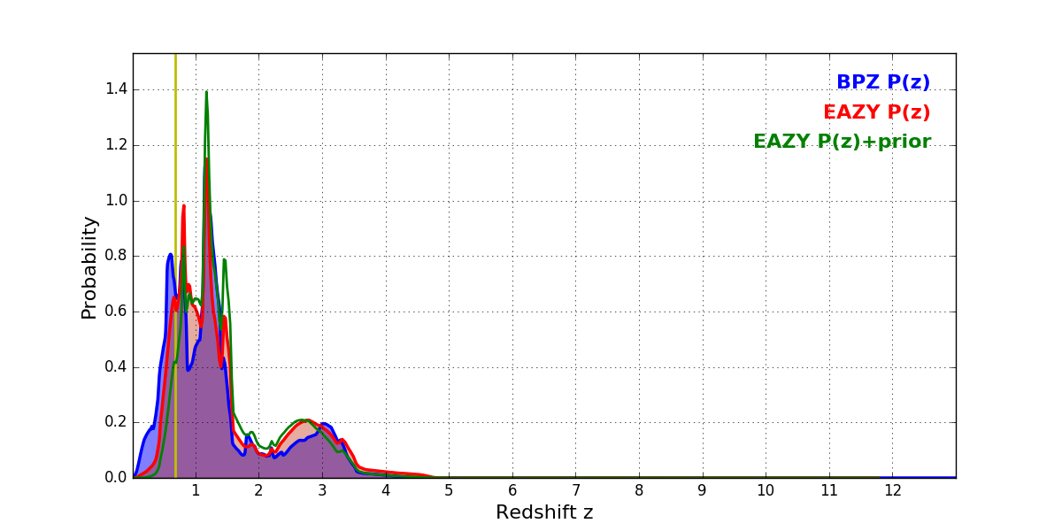 In P(z) plots: Yellow lines mark the cluster redshift z = 0.677,