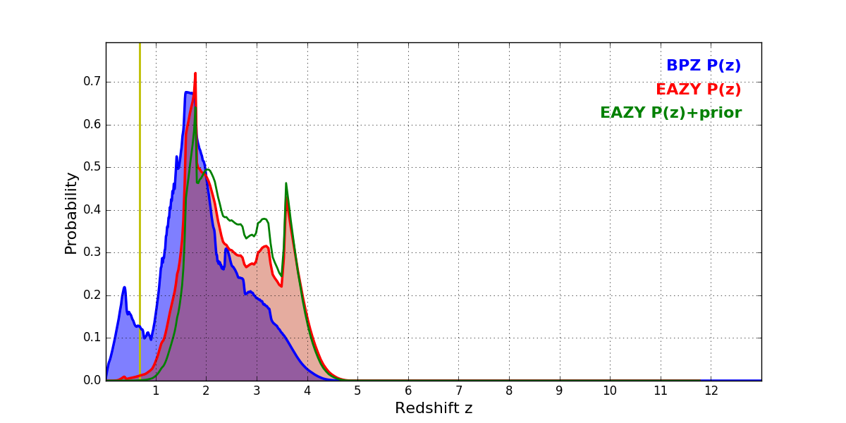 In P(z) plots: Yellow lines mark the cluster redshift z = 0.677,
