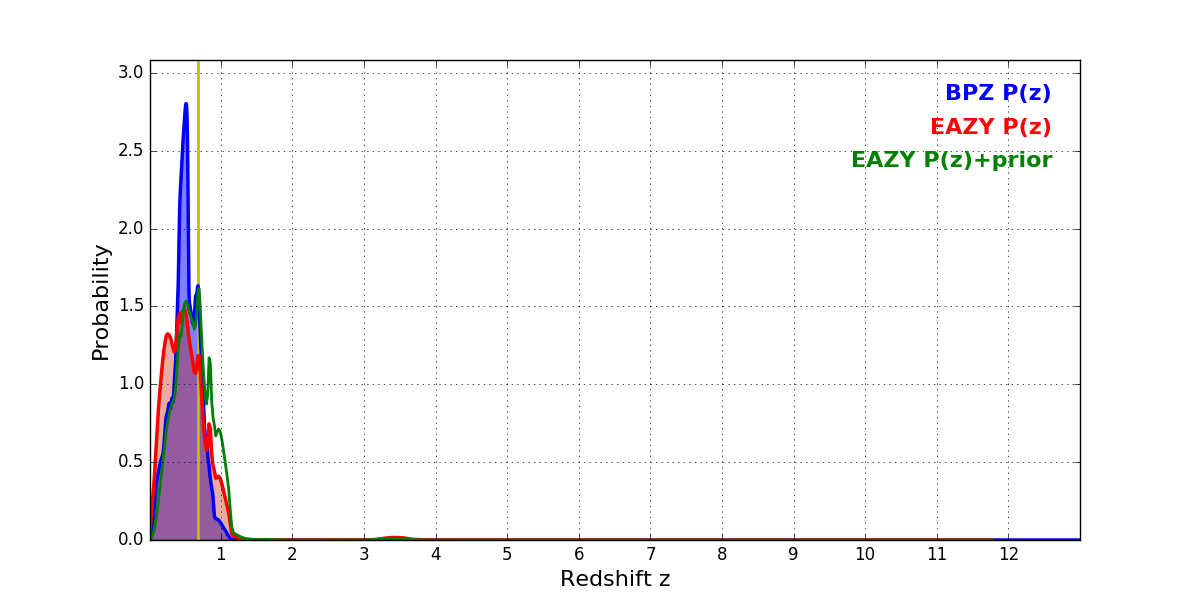 In P(z) plots: Yellow lines mark the cluster redshift z = 0.677,