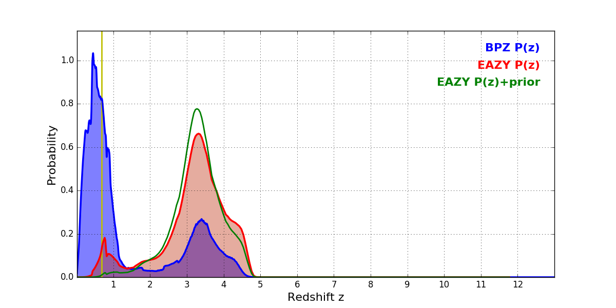 In P(z) plots: Yellow lines mark the cluster redshift z = 0.677,
