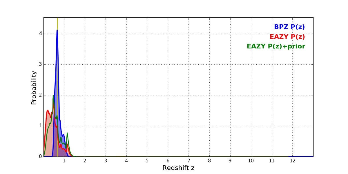 In P(z) plots: Yellow lines mark the cluster redshift z = 0.677,