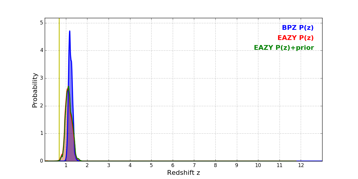 In P(z) plots: Yellow lines mark the cluster redshift z = 0.677,