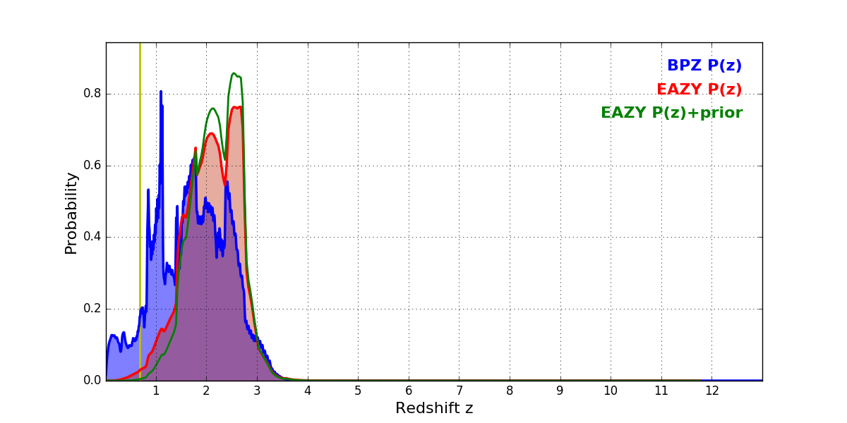 In P(z) plots: Yellow lines mark the cluster redshift z = 0.677,