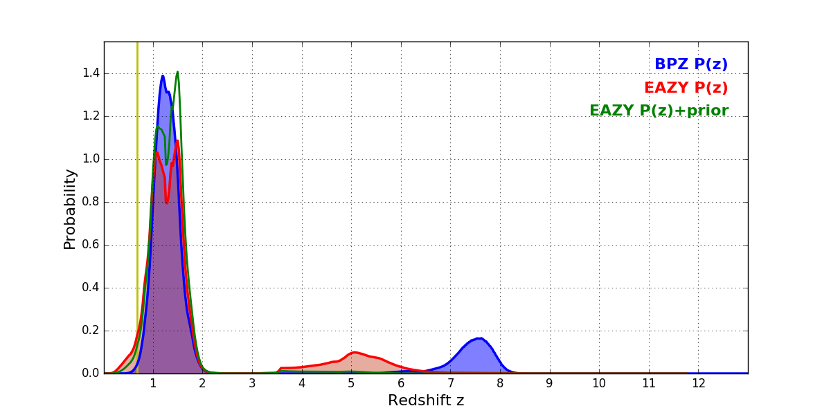 In P(z) plots: Yellow lines mark the cluster redshift z = 0.677,