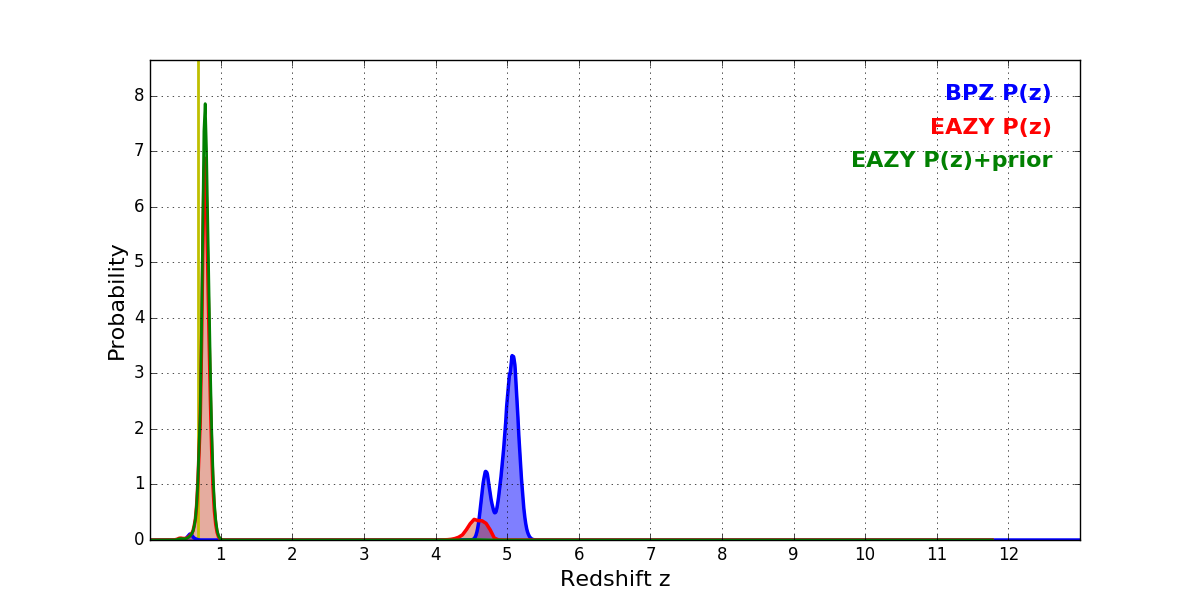 In P(z) plots: Yellow lines mark the cluster redshift z = 0.677,