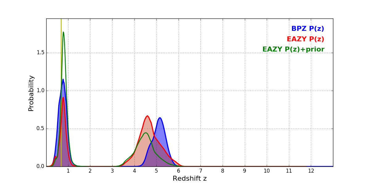 In P(z) plots: Yellow lines mark the cluster redshift z = 0.677,