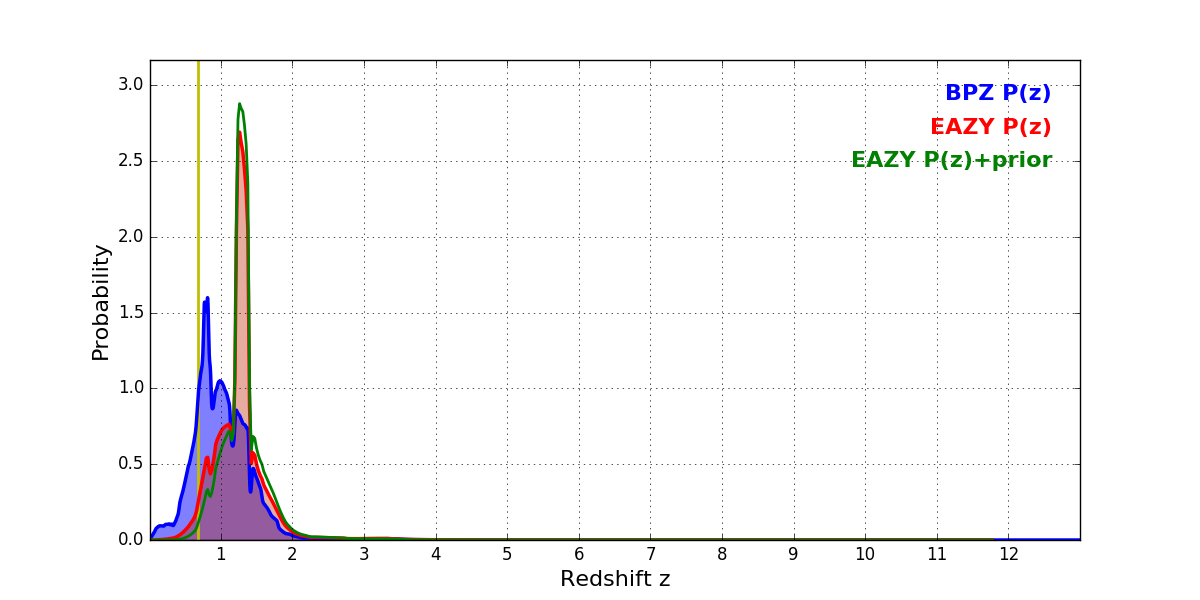In P(z) plots: Yellow lines mark the cluster redshift z = 0.677,
