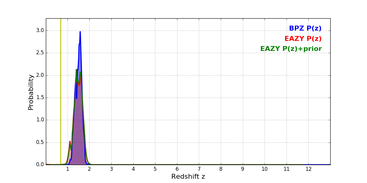 In P(z) plots: Yellow lines mark the cluster redshift z = 0.677,